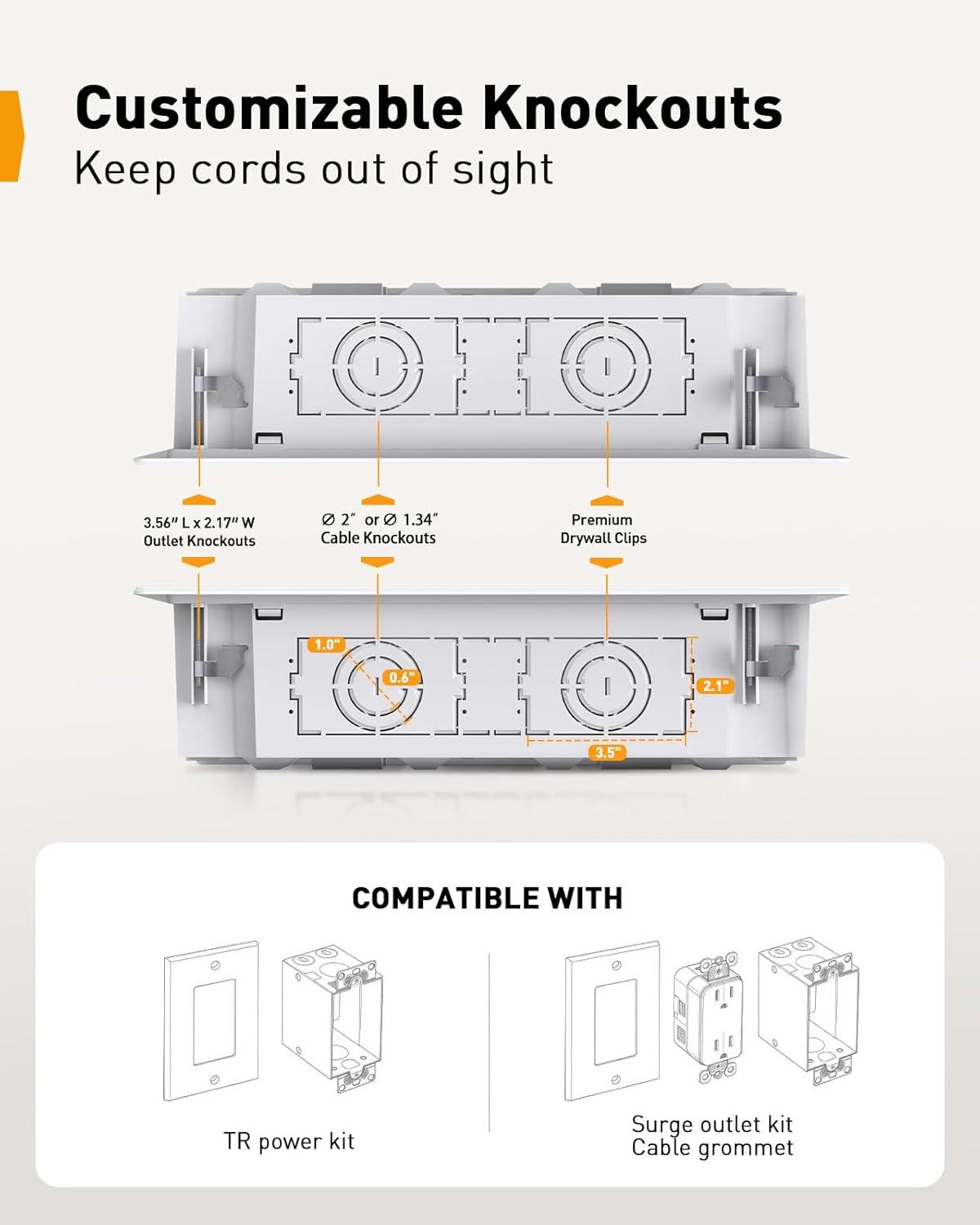Choose Your Own Configuration: Featuring removable knockouts, our recessed outlet box offers multiple pre-set openings for a tailored setup. Easily choose the ideal position and size for cable routing or power outlet (not included) installation – for a media connection that suits you. Plus, the included hook and loop strips help keep cables neatly bundled, preventing tangles and ensuring a well-organized, clutter-free media space.