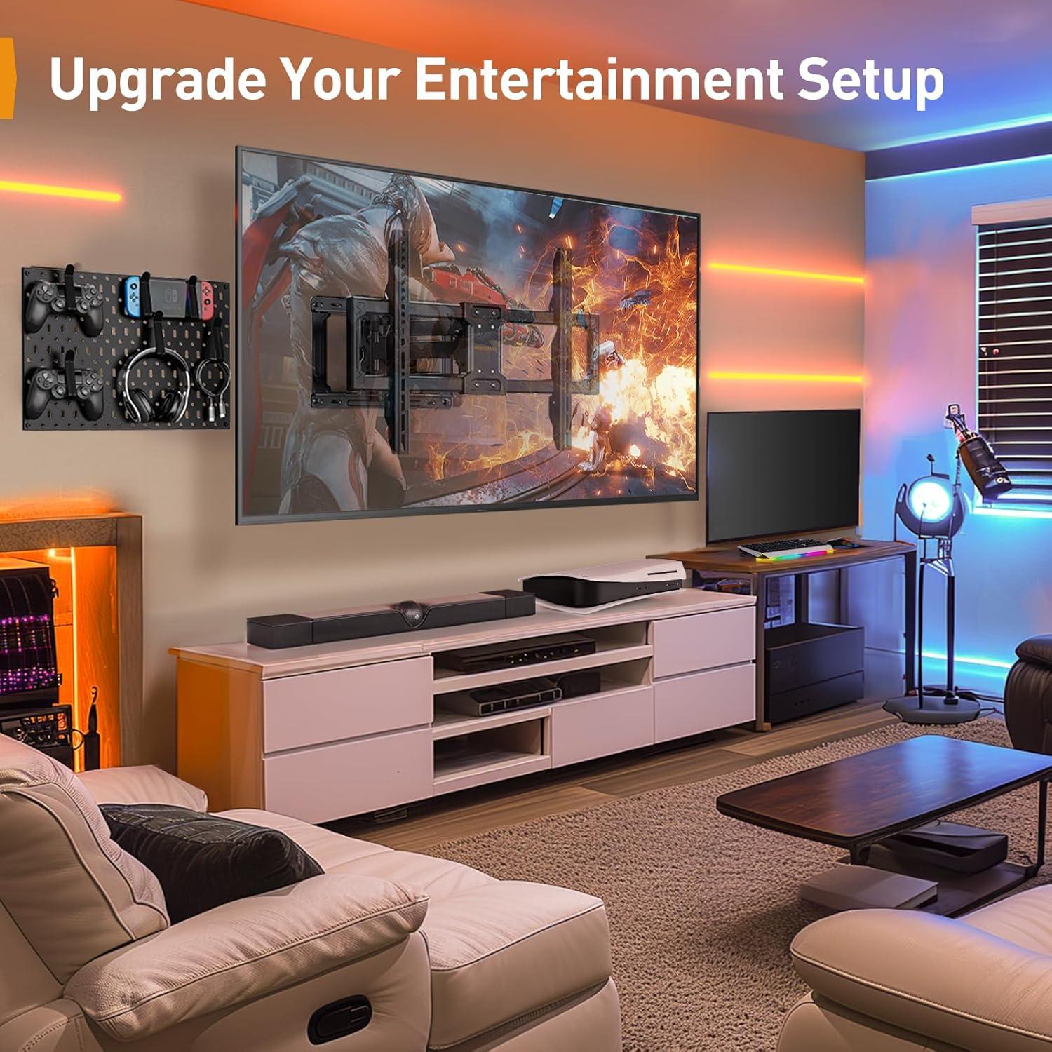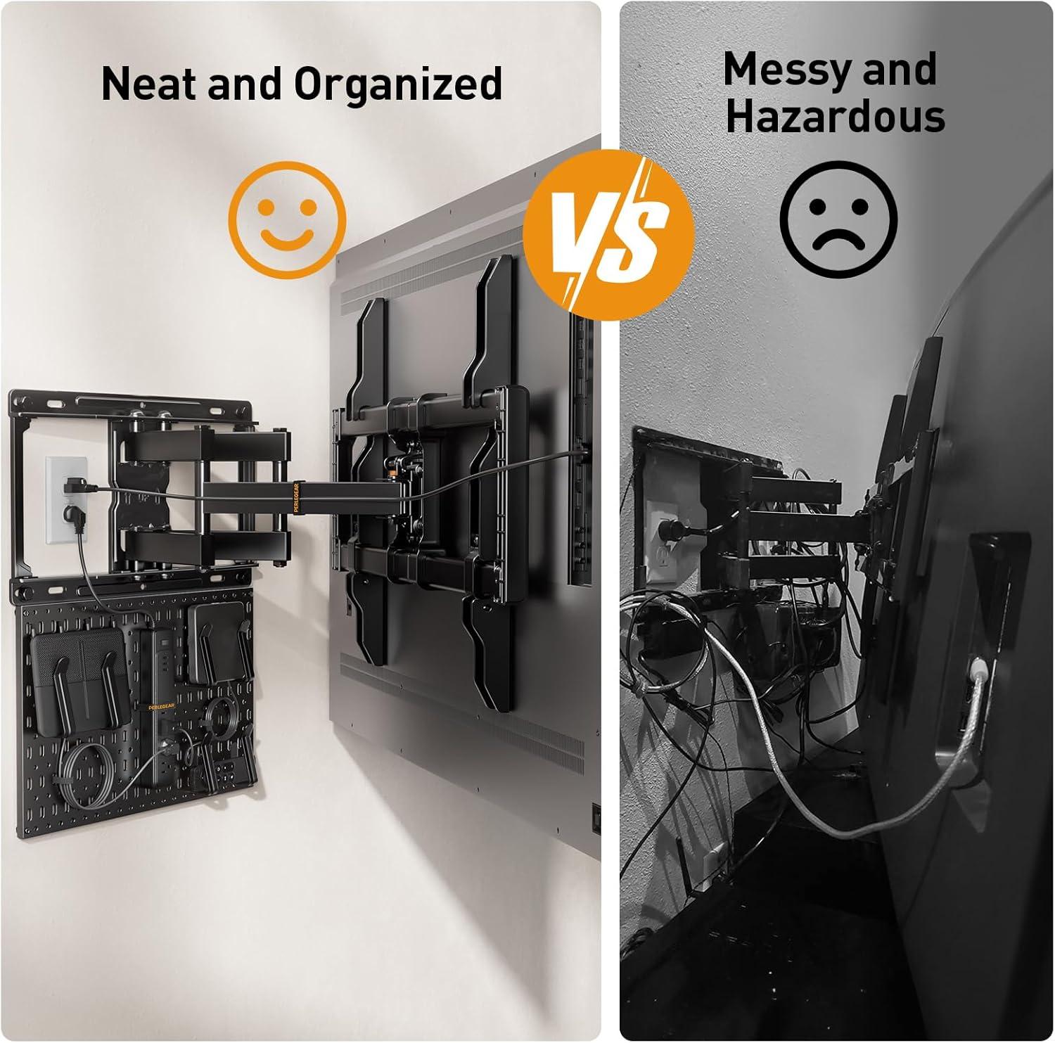 Organization Made Simple: Our full motion TV mount includes a metal pegboard with 6 hooks and cable ties to organize TV peripherals including power strips, streaming devices, remotes, gaming controllers, headphones, and more. Keep you cables neatly organized to avoid tripping risks and electrical hazards.