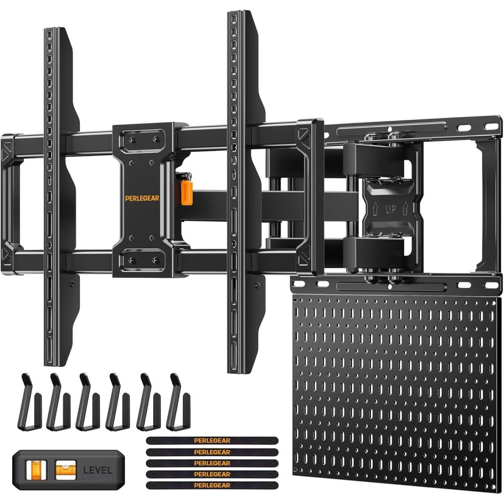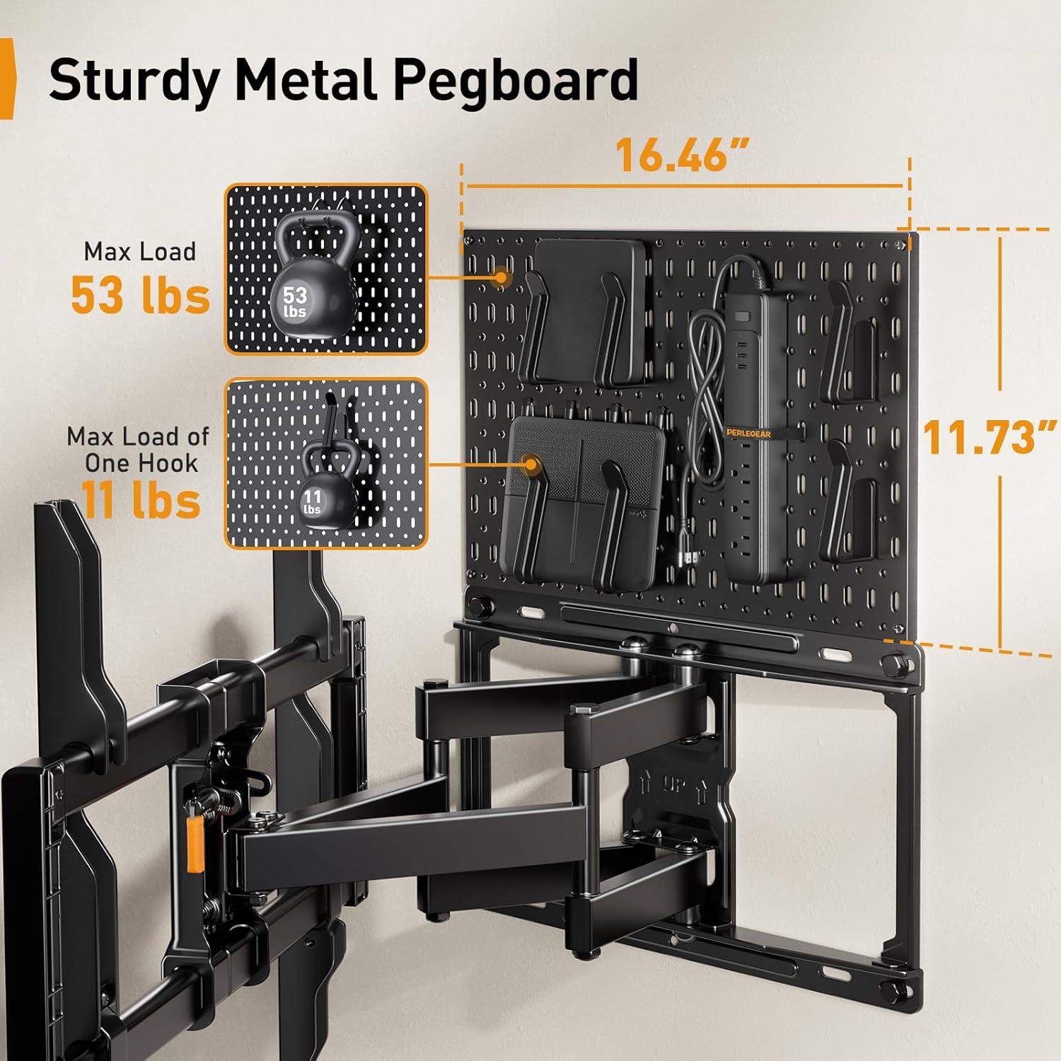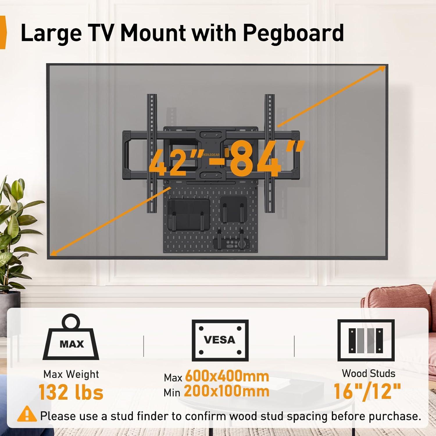 PERLEGEAR Full Motion TV Mount with Metal Pegboard for Most 42-84 inch Flat or Curved TVs up to 132 lbs, TV Wall Mount with Swivel & Tool-Free Tilt, Max VESA 600x400mm, Fits 12″/16″ Wood Studs, PGLF17