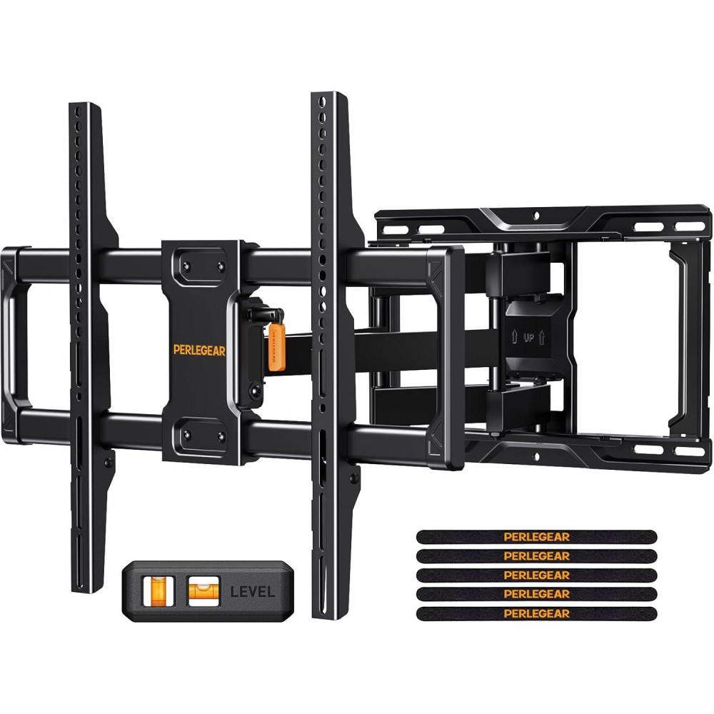 Strong & Solid: Featuring dual articulating arms and heavy-duty steel construction, this TV wall mount bracket is performance, durability, and safety, and can hold up to 132 lbs. The upgraded wall plate is wider for more support, while anti-drop end caps and security locks help to keep your TV in place.