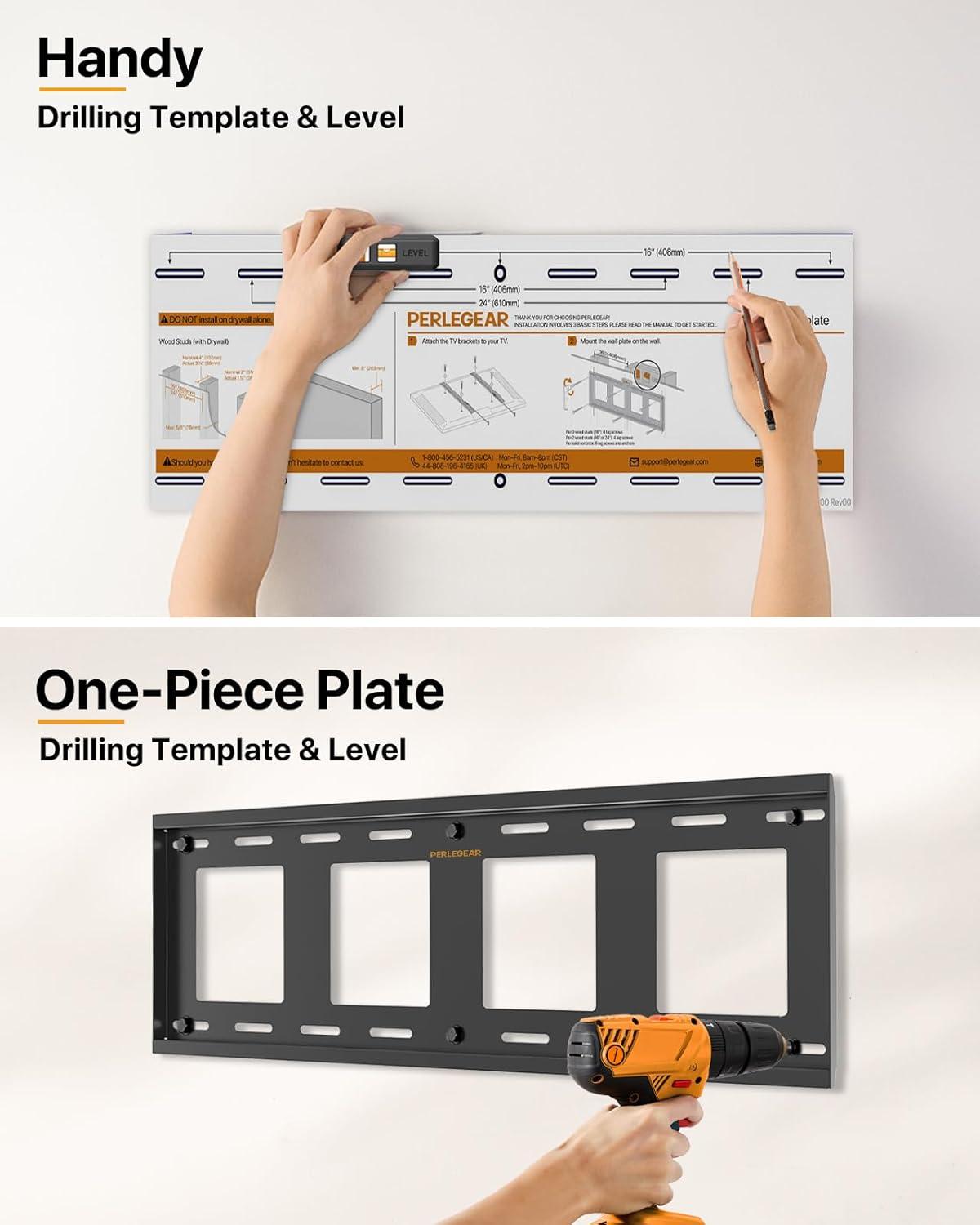 Built to Endure: Crafted using heavy-duty steel, this 100 inch TV wall mount features a 45% thicker bracket and a 30% taller plate for enhanced durability. The one-piece construction can support up to 225 lbs, providing a secure hold for large, heavy TVs. Its robust design ensures your TV stays firmly in place, with no wobbling or risk of slippage.