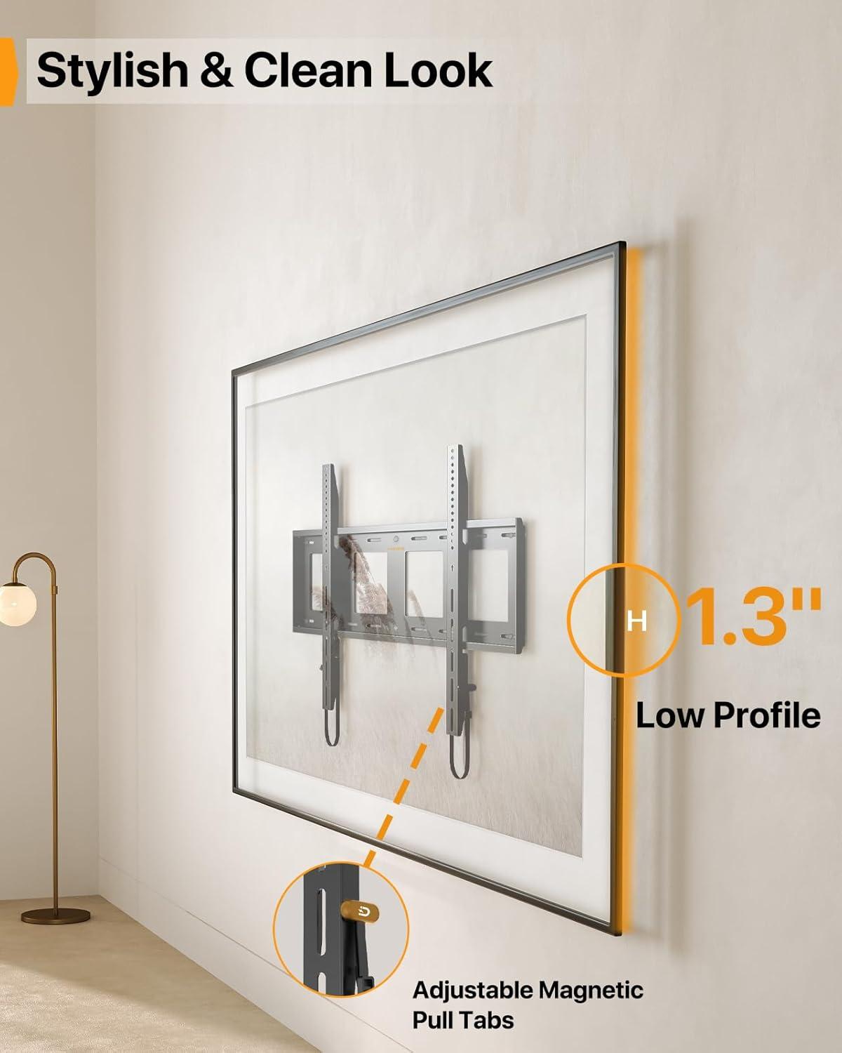Slim and Streamline: Our innovative flush TV mount features adjustable magnetic pull tabs, which conceal behind the screen when not in use. This low-profile wall mount keeps your TV just 1.3″ from the wall, saving space and enhancing the aesthetic of any room.