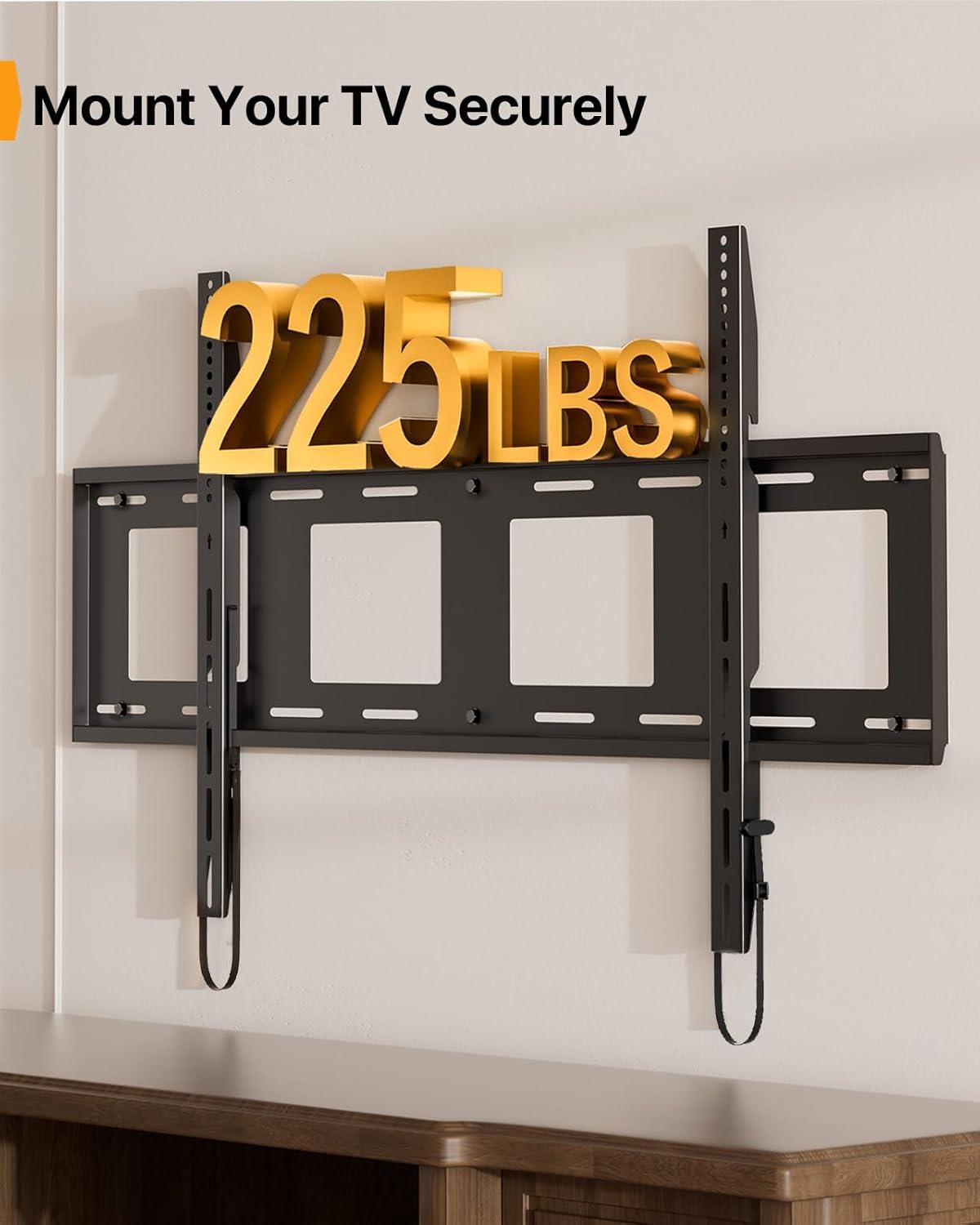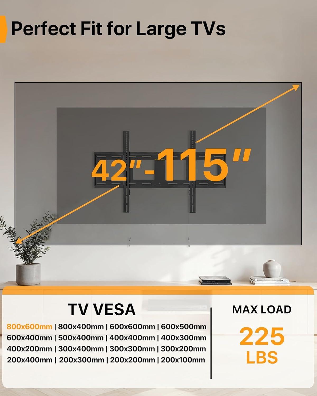High-Capacity for Wide TVs: This fixed TV wall mount is compatible with most 42″ to 115″ flat or curved TVs with VESA patterns 200x100mm to 800x600mm. Please verify the size, weight, and VESA pattern of your TV before purchase. The TV bracket can support 225 lbs – 20% more weight than other similar mounts.