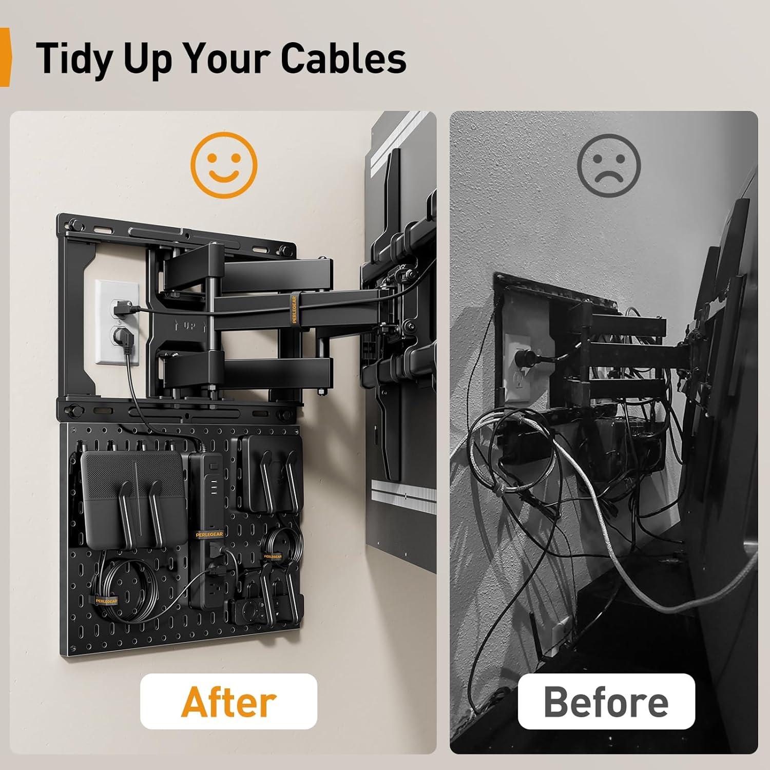 Tidy Up Your Cables: Our pegboard wall organizer comes with 5 hook & loop strips to neatly route cables and cords along the arms of your wall mount TV bracket. Easily hang power strips to keep electronics organized and clutter-free. Organizing your setup can avoid electrical and tripping hazards posed by loose wires.