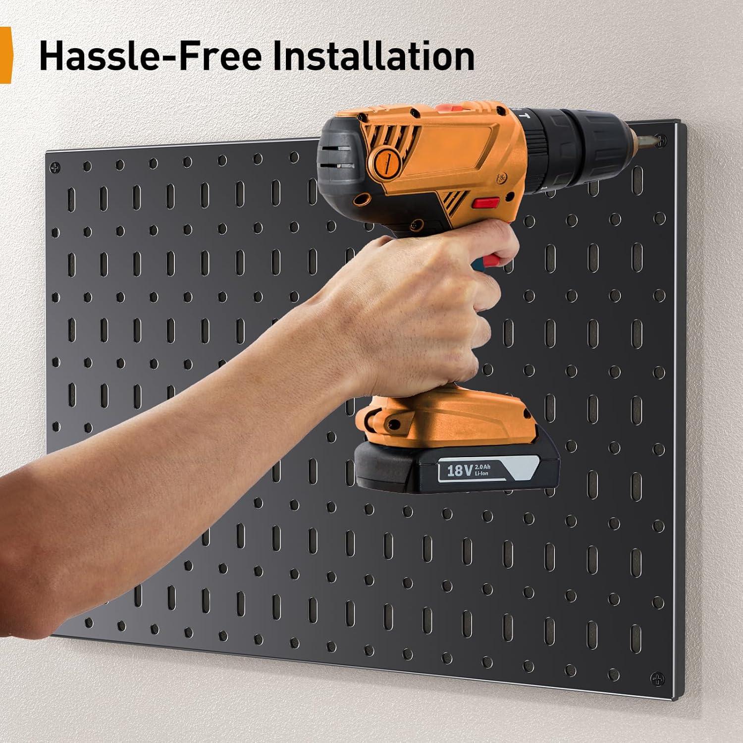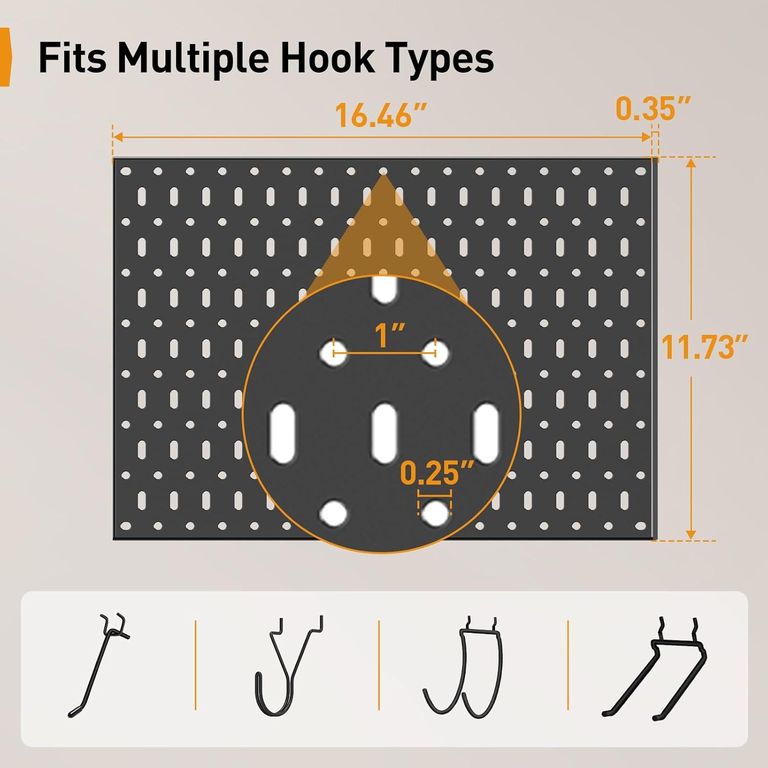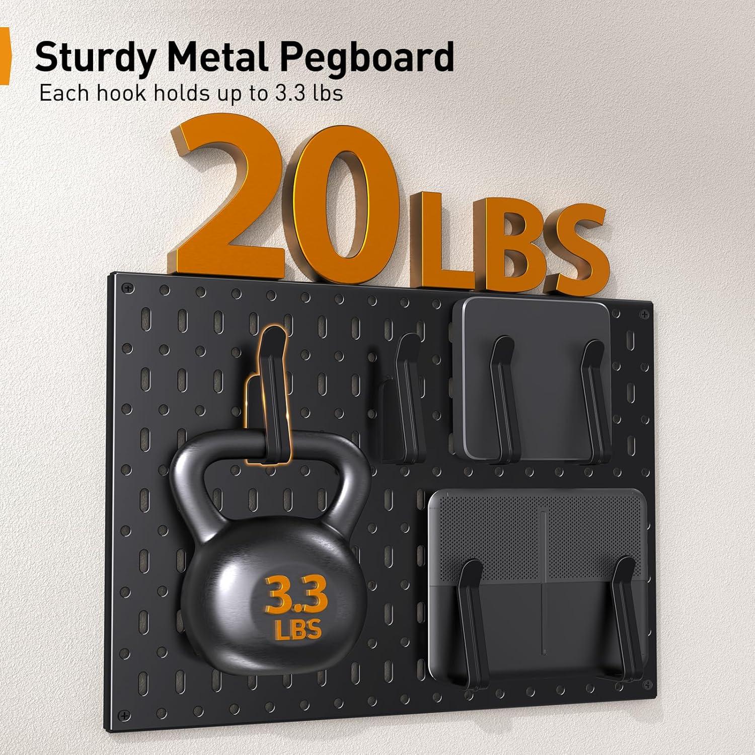 Sturdy Metal Pegboard: Crafted from premium heavy-duty steel, our peg board is engineered to support up to 20 lbs, while each hook can hold up to 3.3 lbs. The powder-coated finish ensures durability, making the pegboard ideal for both indoor and outdoor use without warping or bending.