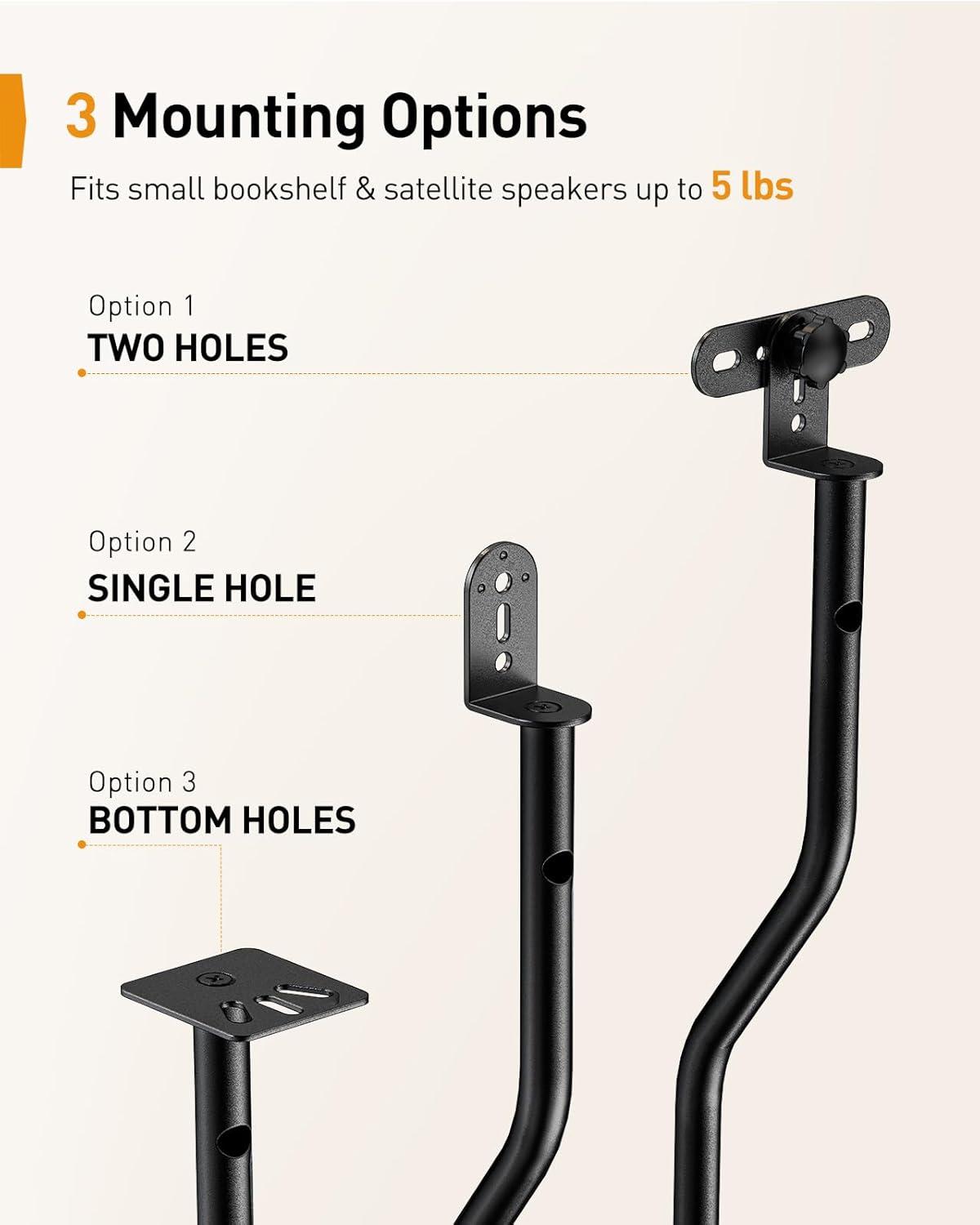 Wide Compatibility: This Perlegear speaker stand is designed to support most small bookshelf, satellite speakers and studio monitors up to 5 lbs. Whether your home theater sound system has speakers with threaded holes, keyhole slots, or no holes at all, the included hardware accommodates all three mounting configurations.