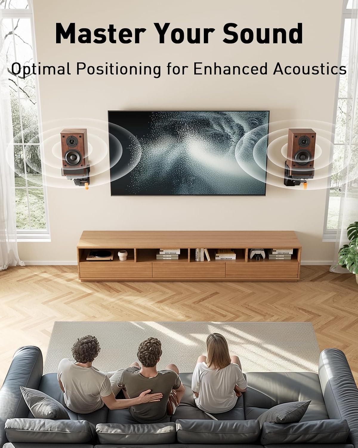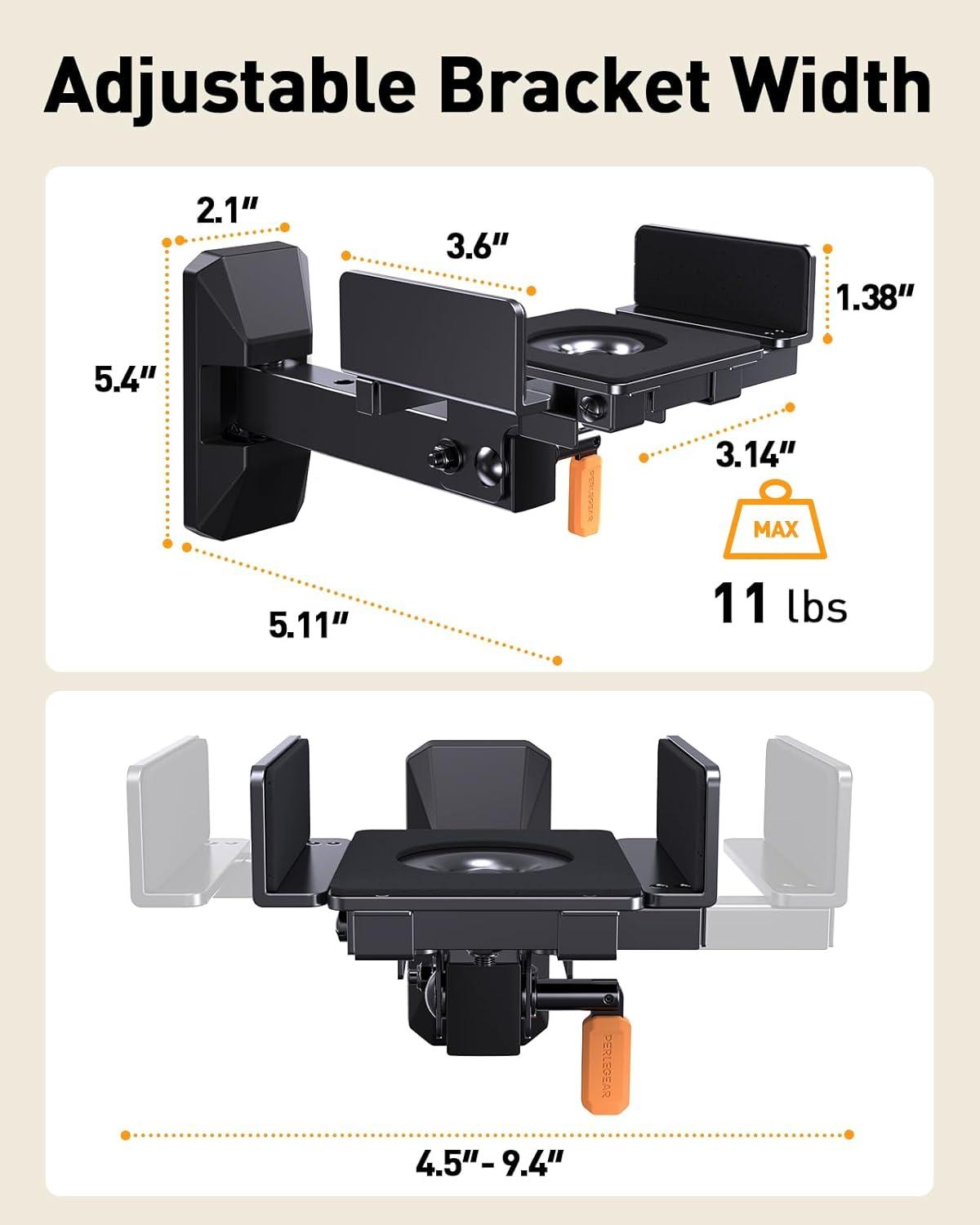 Adjustable Speaker Fit: Our bookshelf speaker wall mount’s clamping mechanism can adjust to fit speakers from 5.4″ to 9.9″ wide, ensuring a secure grip for a broad range of speakers.